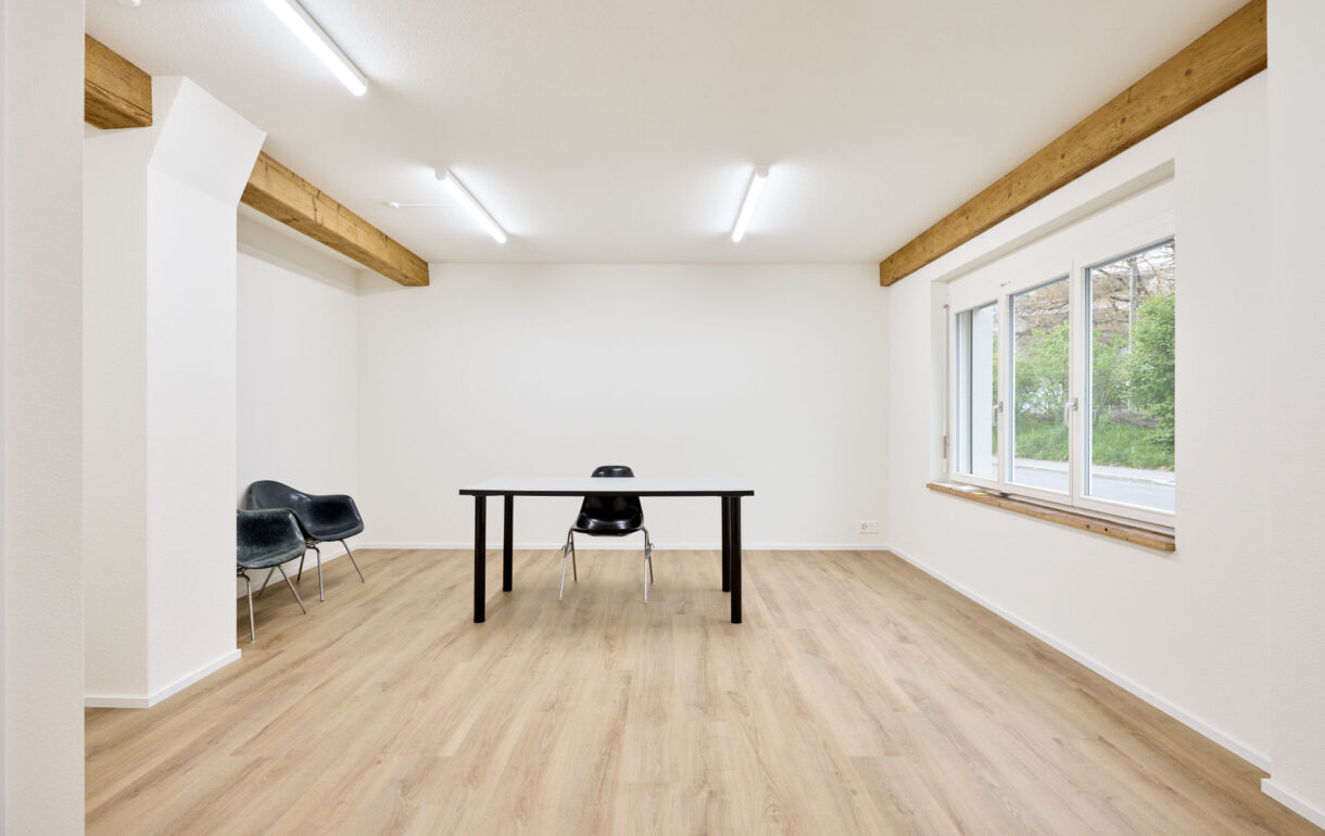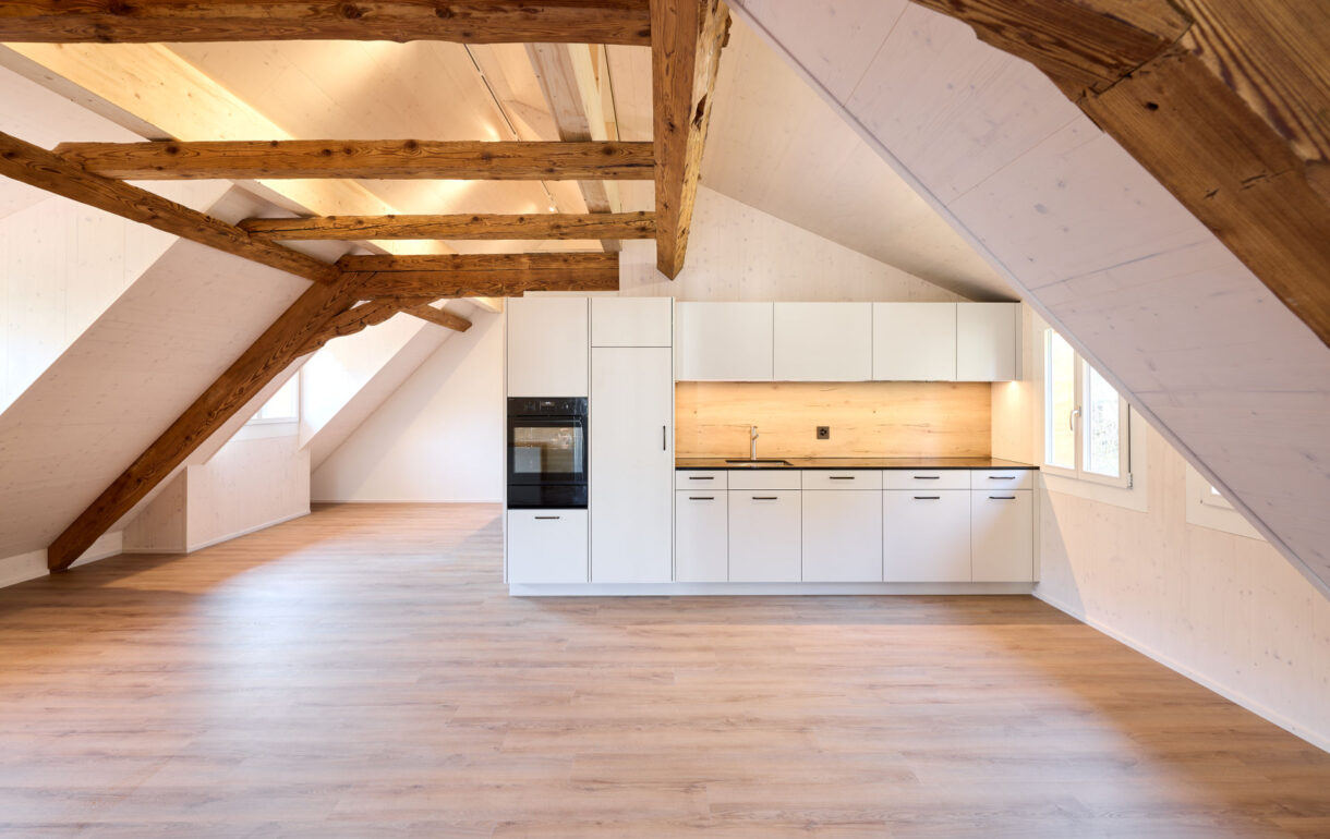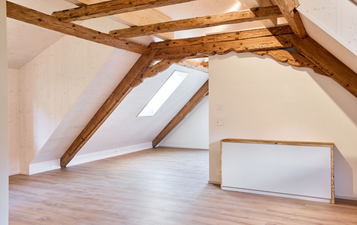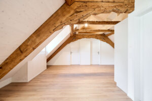 Das Eindrücklichste im ganzen Gebäude ist sicherlich der «Liegende Dachstuhl» mit seiner beachtlichen Grösse. Welch herrliche Zimmermannskunst! Das Satteldach mit Krüppelwalm ist freitragend und hat auf der gesamten Länge keinerlei Stützpfosten. Bei der Restaurierung wurden die alten Balken und Verbinder von Hand gebürstet und mit Trockeneis vom Staub befreit.