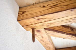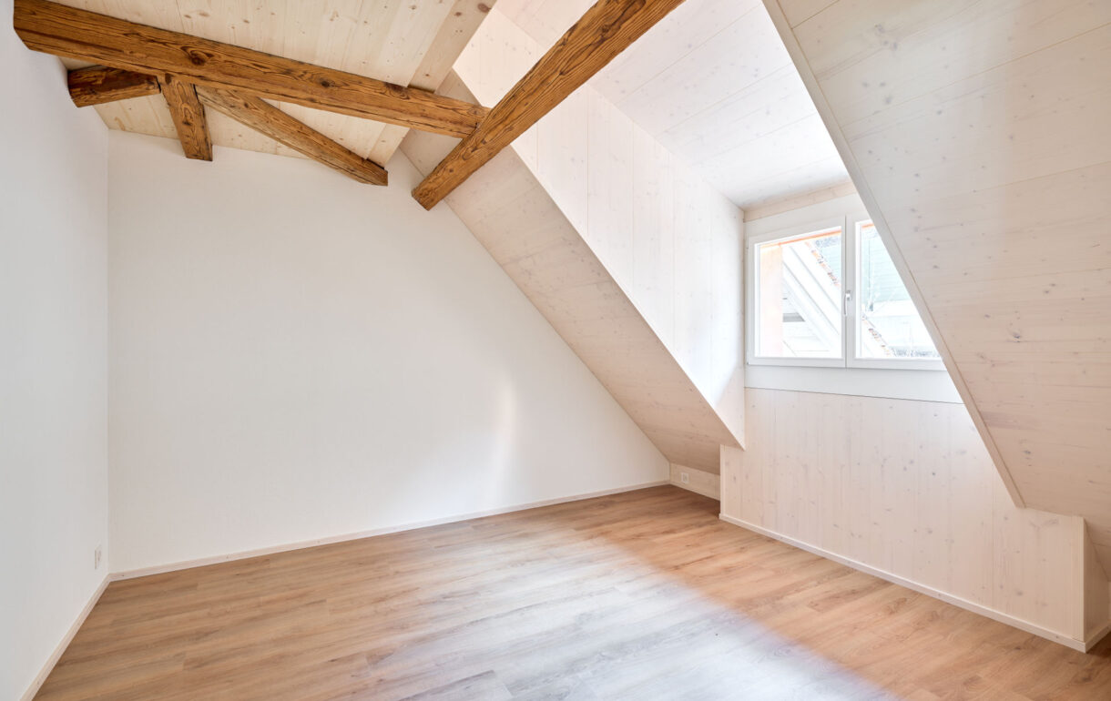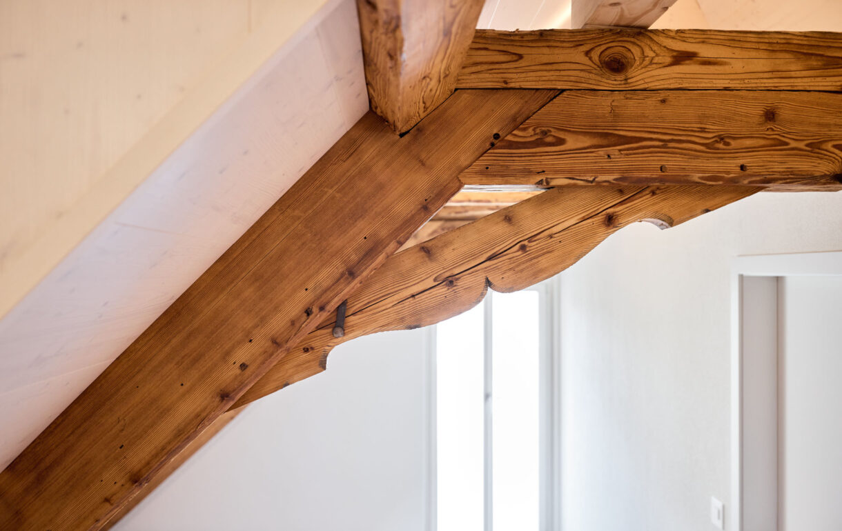Das Obergeschoss ist ebenfalls geschmackvoll ausgestattet. So gibt es elegante Decken Stuckaturen sowie markante, bei der Restauration vom Gipsverputz befreite sichtbare Kreuzriegel. Die Wandverkleidungen in den Zimmern mit Füllungen und Rahmen aus Fichtenholz präsentieren sich nun wieder in einem hübschen Naturton, nachdem sie restauriert und diverse Farbschichten abgelaugt wurden. Die bestehenden historischen Zimmertüren mit den profilierten Türrahmen sind ebenfalls noch Originale. Verdeckt unter vier darüber liegenden Böden fanden sich noch die Original-Kassettenböden mit Nussbaumrahmen und Fichtenfüllungen. Sie wurden, wie die Buffets und Wandverkleidungen, demontiert, sorgsam restauriert und wieder am gleichen Ort verbaut.