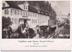 Die Liegenschaft «Kreuz» befindet sich an der ursprünglichen Gotthardstrasse. In den angrenzenden Stallungen wurden bis zur Eröffnung der Gotthardbahn (1882) die Kutschenpferde gewechselt und eingestallt. Die Gäste genossen Speis und Trank und eine einfache Unterkunft im Hauptgebäude.