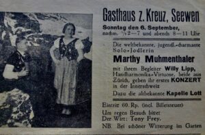 Ab 1806 verliert sich die Spur der jeweiligen Hausbesitzer, bis die Liegenschaft 1910 durch einen Zwangsverkauf in den Familienbesitz der jetzigen Eigentümer gelangte. Die Urgrosseltern Karl und Katharina Schuler-Kälin stammten mit ihren 3 Töchtern und 2 Söhnen vom Bauernhof «Schornen» in Steinen. Das «Kreuz» war damals in keinem ansehnlichen Zustand. Als die Eltern kurz hintereinander starben, übernahmen die Töchter den Betrieb. Mit Anton Frey, der 1933 eine der Töchter heiratete, kam Wende ins «Kreuz». Im «Sääli», wo die Familie früher wohnte, richtete Anton eine Schneiderei und Hutmacherei ein. Mit der «Haute Couture» konnte endlich Geld erwirtschaftet werden, um das Haus ein bisschen zurecht zu machen. Antons grosse Leidenschaft war die Volksmusik. Als begeisterter Handörgeler führte er Ländlerkonzerte mit Tanzgelegenheit im «Kreuz» durch: