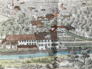 Die Brücke wurde zwischenzeitlich weiter nach Süden verschoben und an der Stelle die Toiletten eingebaut. Geblieben ist die wunderbare Hauseingangstüre mit dem attraktiv profilierten Rahmen. Der Türklopfer aus der Zeit um 1700 sowie die Risse und Holzwurmlöcher im Türrahmen erzählen ihre eigene Geschichte.